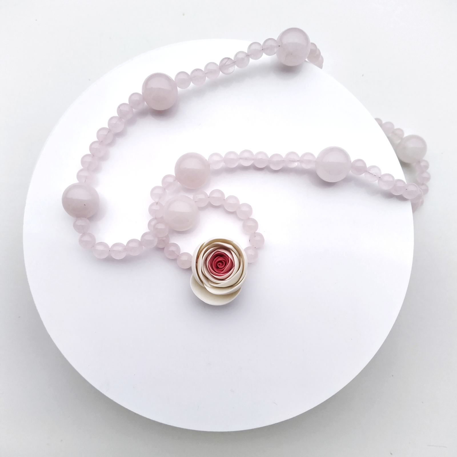 Dimensions:  2.3 x 2.5 cm - pendant/ 58 cm - natural pink quartz, gold plated silver lock