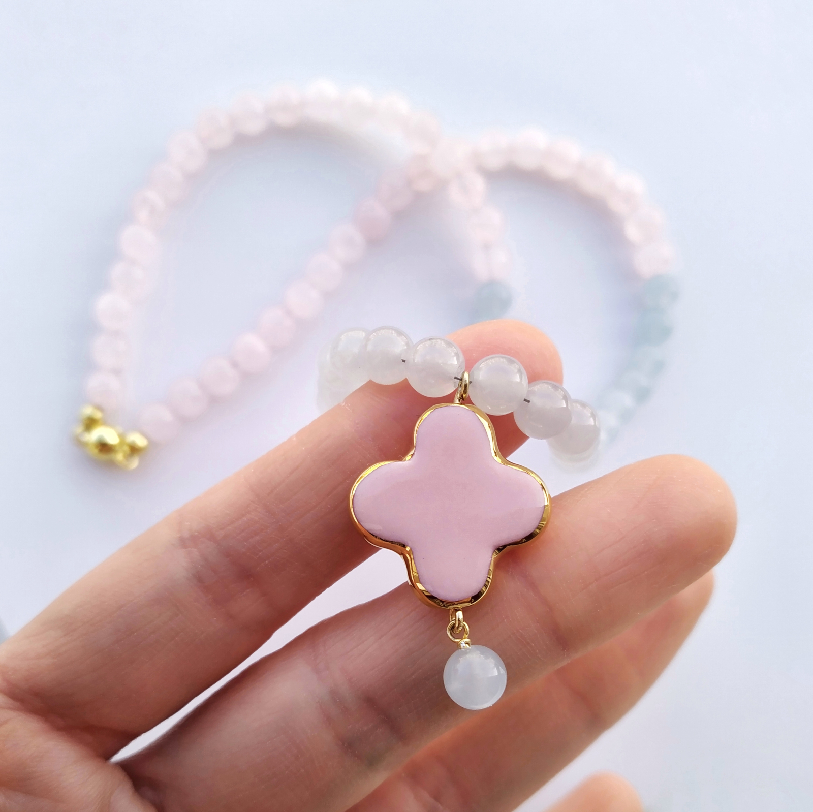 Dimensions: 2,2 x 2,2 cm - cross/ 44 cm – natural pink and blue quartz stone, gold plated silver lock