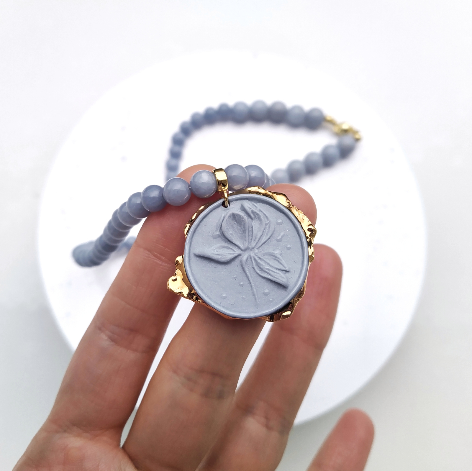 Dimensions: 3 x 3 cm - pendant/ 47 cm - natural Angelite stone, gold plated silver lock Specifications: · Each jewelry piece is unique and carefully hand carved from porcelain by Daniela Catoi. · Easy to wear and comfortable. · The product is three-times fired at high temperatures and, depending on the model, is decorated with pigment, luster, gold or platinum. All accessories are gold-plated silver.