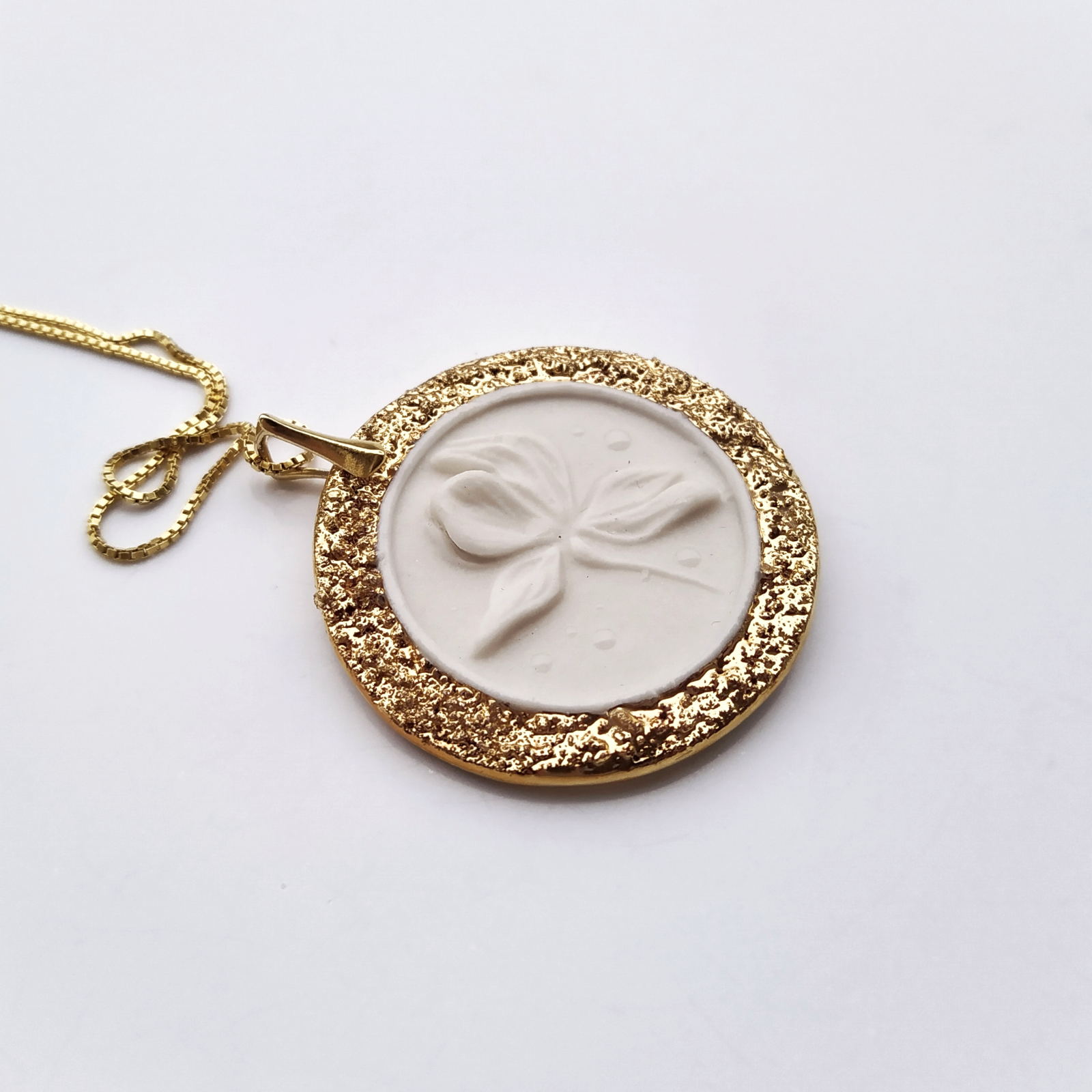 Dimensions: 3.5 x 3.5 cm - pendant/ 42 cm - gold plated silver chain Specifications: · Each jewelry piece is unique and carefully hand carved from porcelain by Daniela Catoi. · Easy to wear and comfortable. · The product is three-times fired at high temperatures and, depending on the model, is decorated with pigment, luster, gold or platinum. All accessories are gold-plated silver.